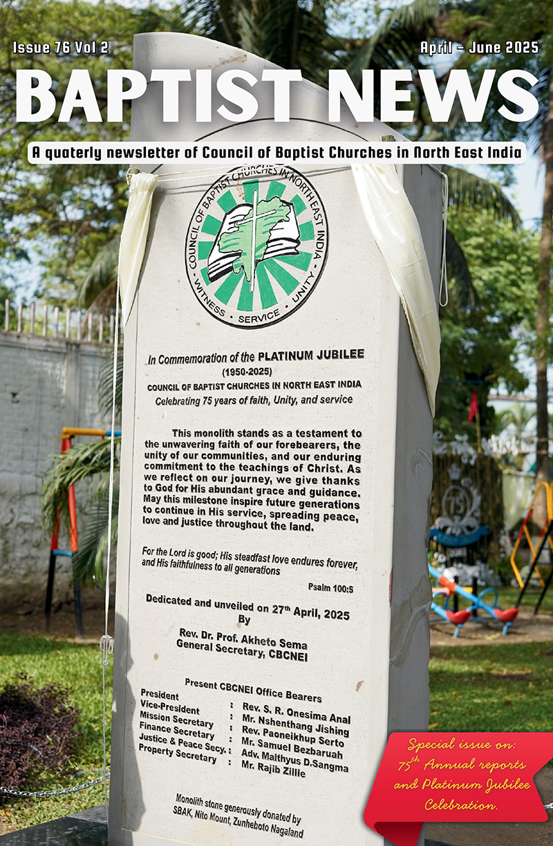 Baptist News is the quarterly news magazine of the Council. This is a channel where every activities of the Baptist Churches in North East India are highlighted. The primary goal of Baptist News has been to publish the news of the events happening in the Baptist family and get connected to each other through God in Spirit and in Truth. This has been a channel of blessings to many in the ministry of God.